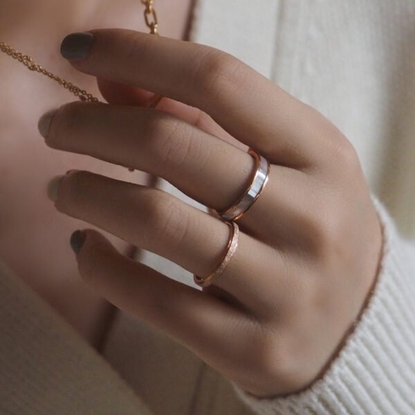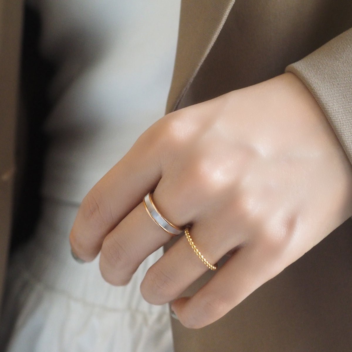 Our?Adaliz Shell Ring is an elegant ring for any finger. It features a band of shell forming a band all the way around the ring then overlaid with a clear coating for protection. Minimalist and elegant. this ring would is subtle enough for everyday wear.