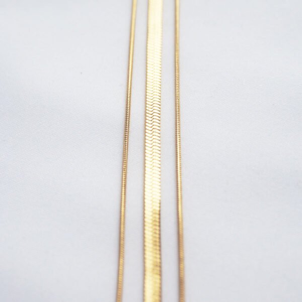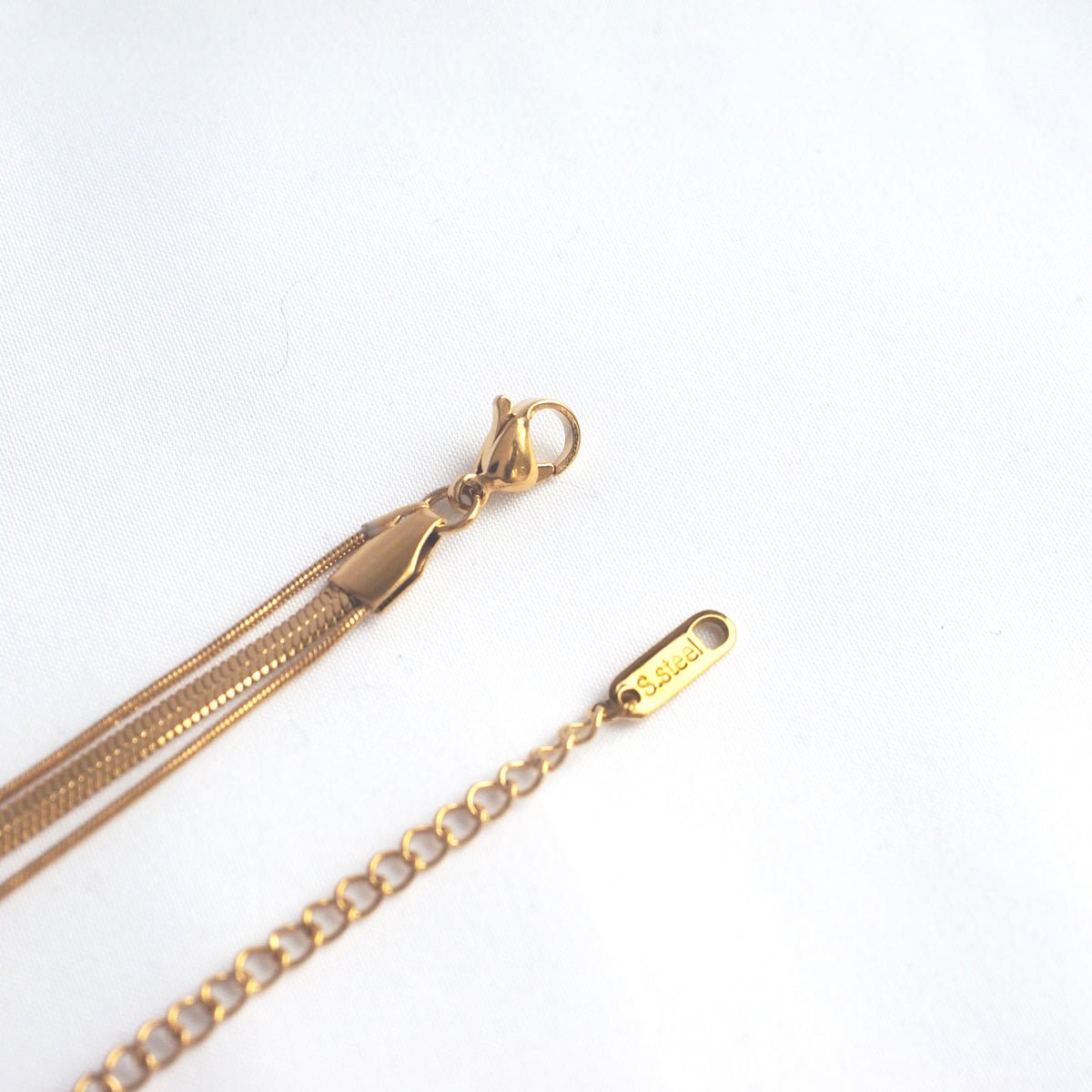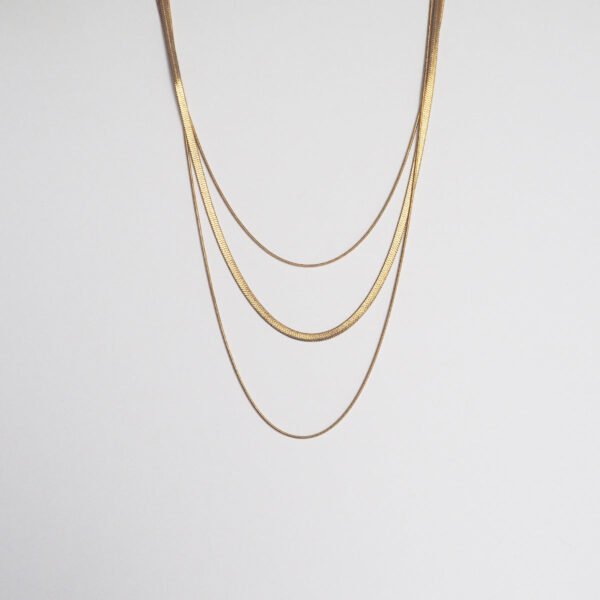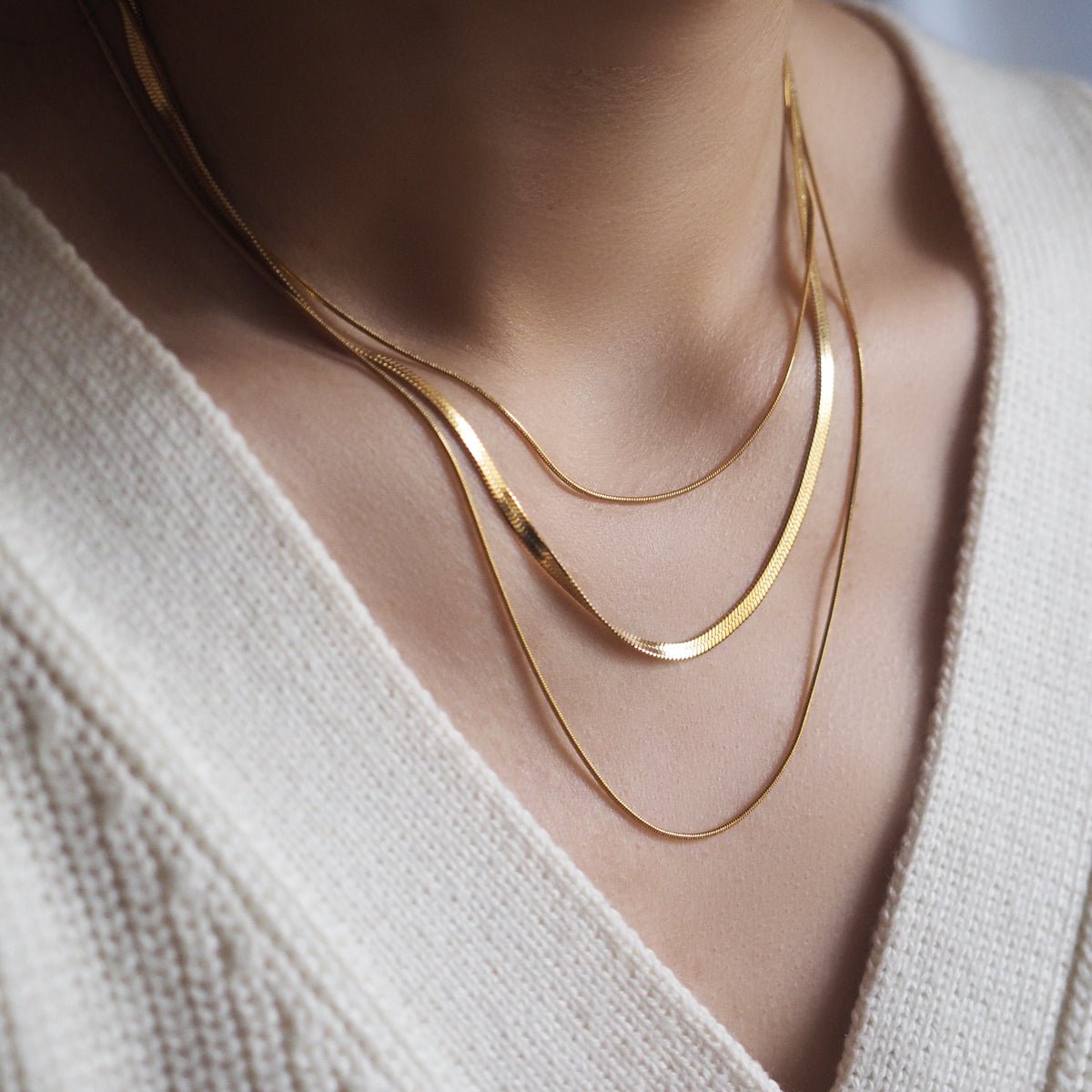 Three classic herringbone chains joined beautifully into one timeless and versatile necklace. Our?Triple Strand Herringbone Chain Necklace?is minimalist but striking.?This is a gorgeous piece that also looks fantastic with everything from business attire to formal wear.?