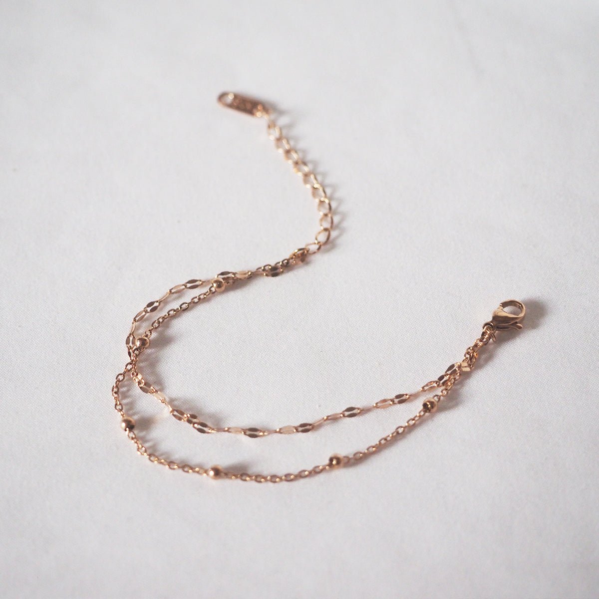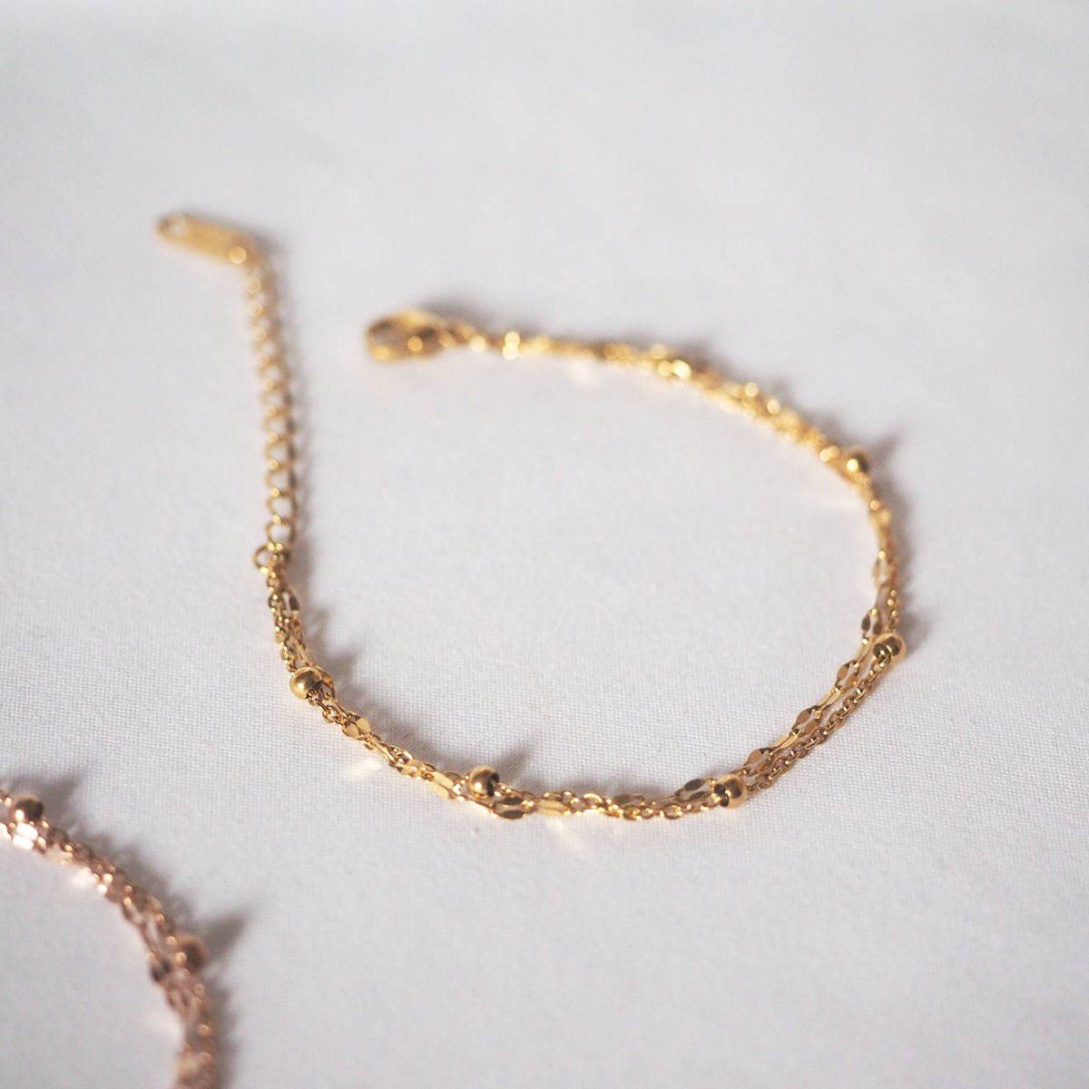 Delicate and trendy. our?Ynez Double Chain Bracelet is the perfect accessory?to sublimate your outfits. It features a two-layer dotted and oval-liked cable chain.?This bracelet is simple enough to be layered with other bracelets but elegant enough to be worn alone in simplicity.